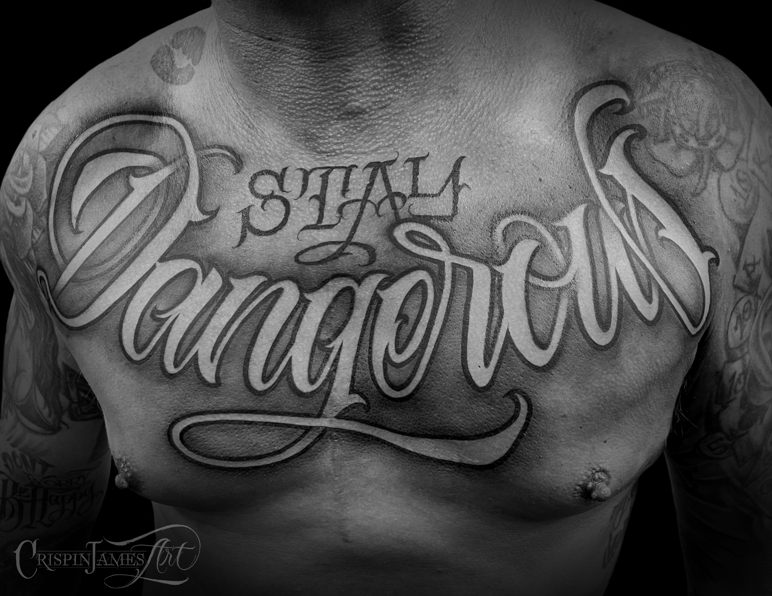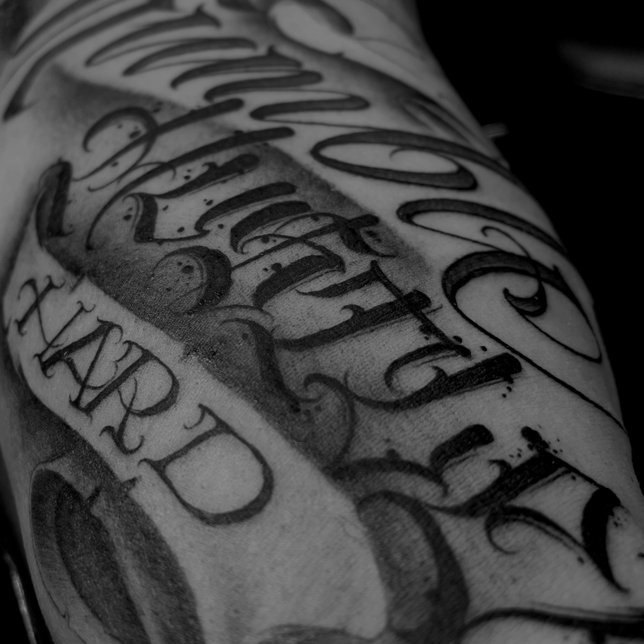 Mixed lettering styles is something I started free handing back in 2012, and since then I’ve mastered my process and technique of finding what best fits each unique person and body placement.